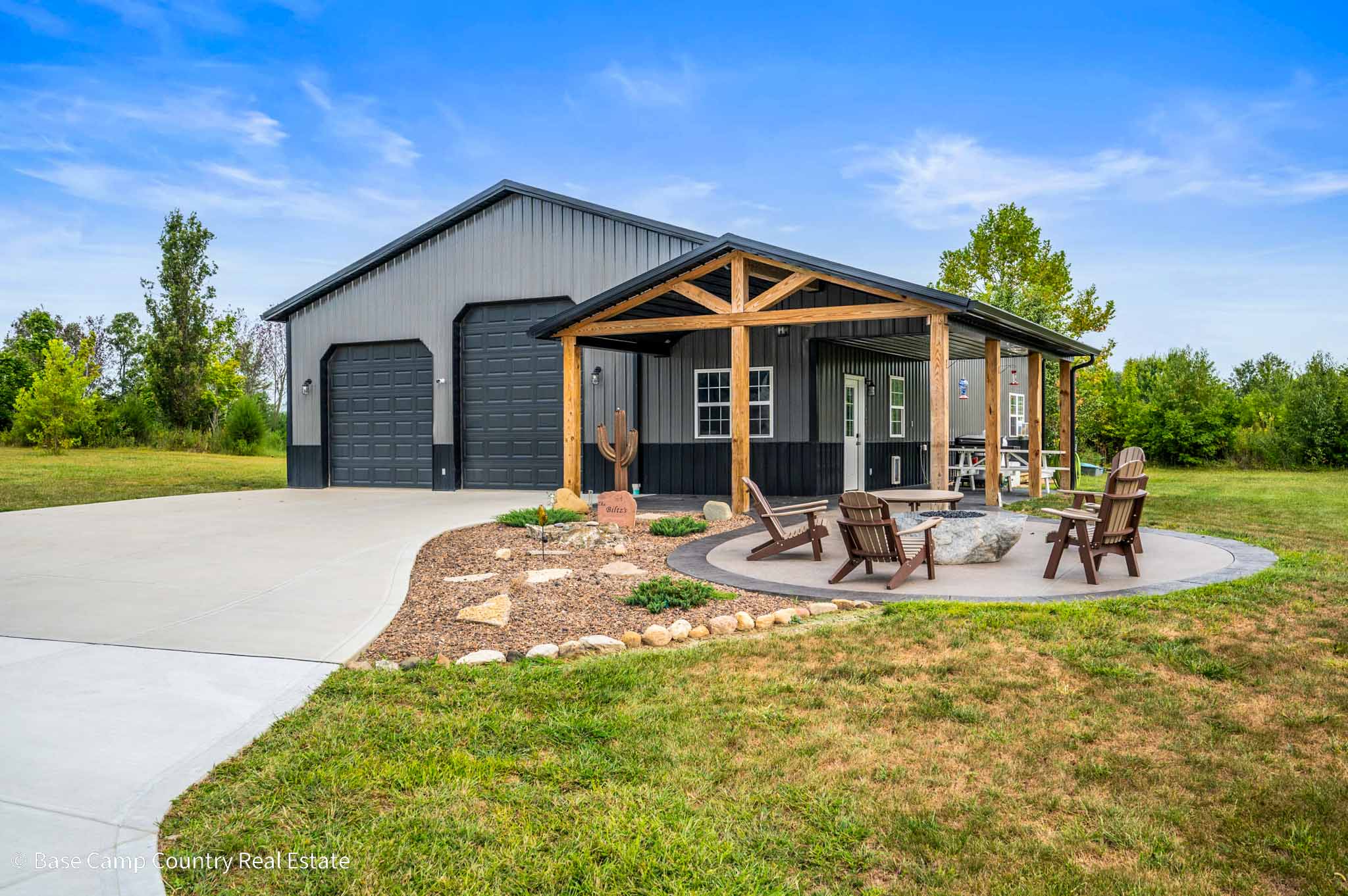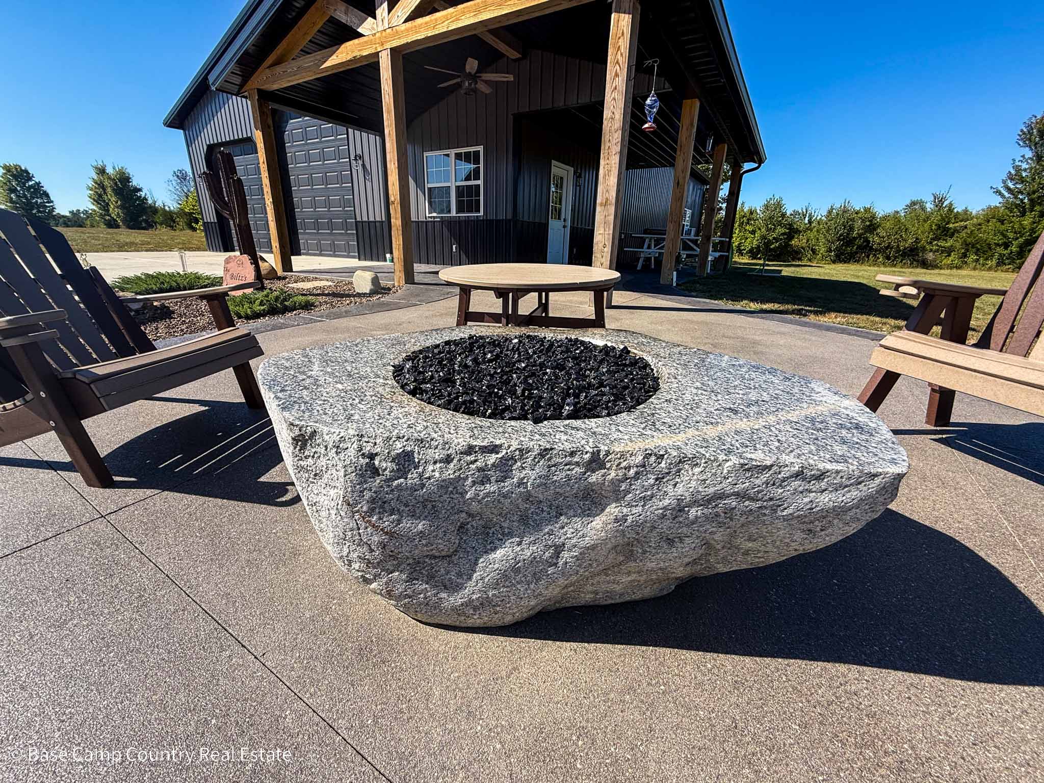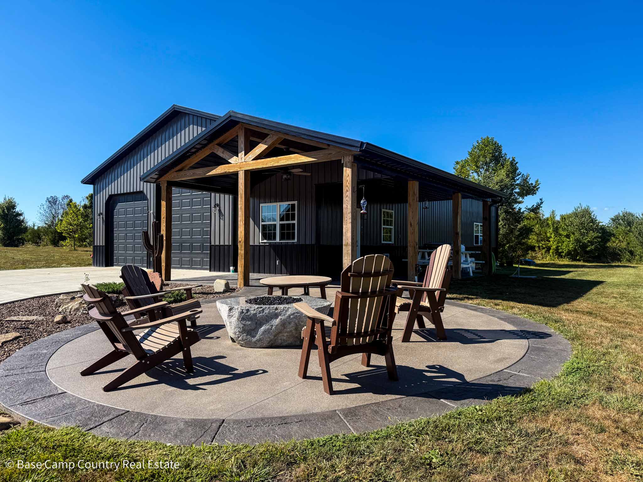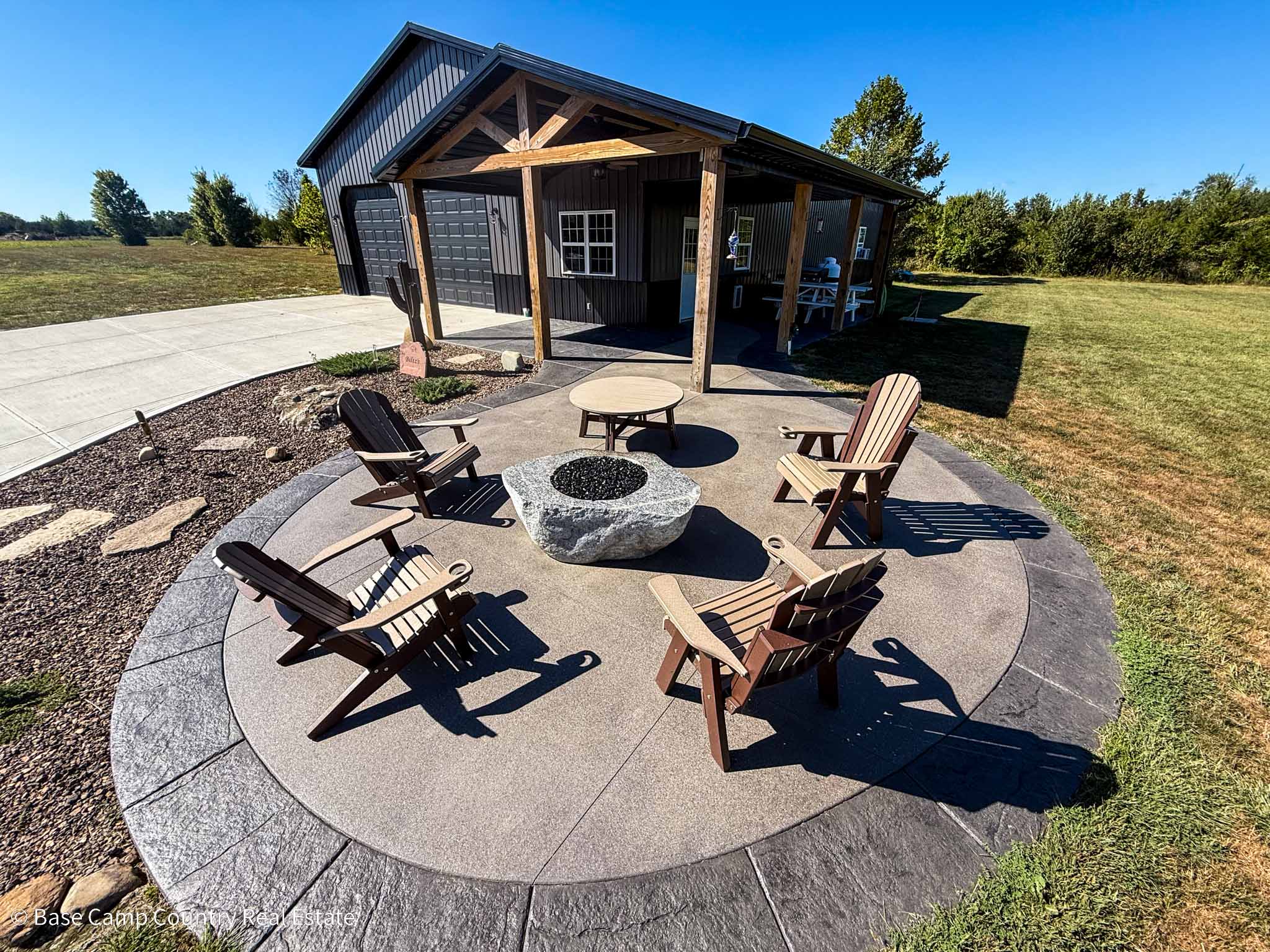 60X 40 pole barn with concrete floors, water and power with apartment / mother-in-law suite. Custom colored concrete patio with gas fire pit and land scaping.