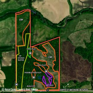 The west side of the property consists of a diverse timber. The timber connects too all the food plots and along the property line. The timber consists of black walnuts, oaks, hickories, elm, basswood, and hackberries. This timber tracts offers excellent hunting opportunities for multiple different winds. This draw is also adorned with massive “wolf oaks”. Wolf oaks describe massive oak trees with broad trunks and wild canopies. These wolf oaks are Iowa’s native Bur Oaks. These massive bur oaks are priceless for their wildlife value in providing acorns for all wildlife. These bur oaks provide a future opportunity for more bur oak propagation also their massive canopies offer perfect roosting for turkeys.
