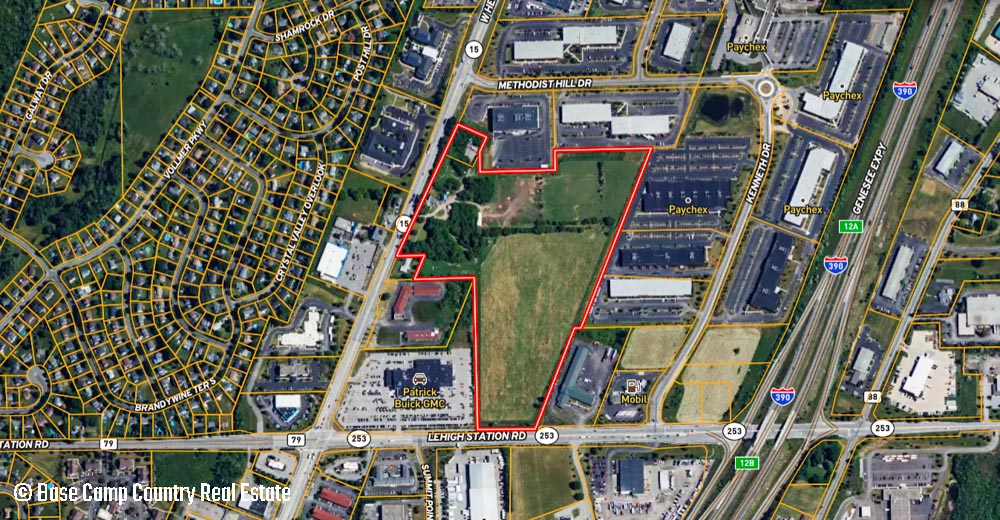 Monroe County, New York – Land For Sale | Base Camp Country Real Estate is offering this 32.76-acre development opportunity in Henrietta, New York. This parcel – formerly part of the Bean family farm – presents a rare chance to acquire a large tract with dual zoning: Industrial (I) and Commercial (B-1). Located along West Henrietta Road (NY-15) with additional frontage on Lehigh Station Road, the property is 0.3 mile from I-390 leading to I-90 (the NYS Thruway).
