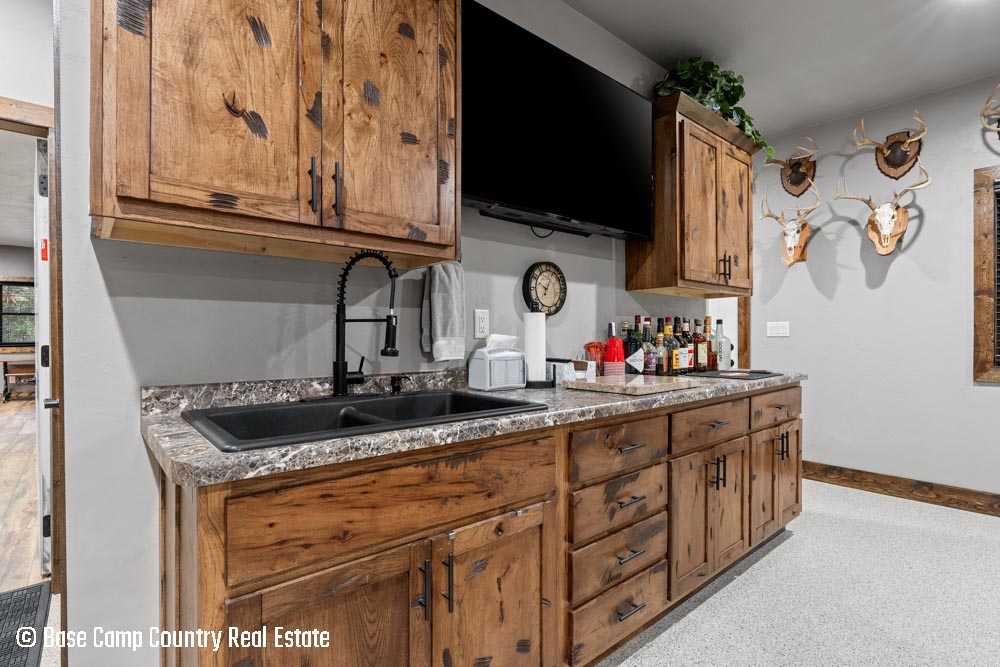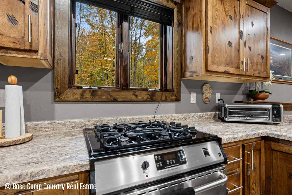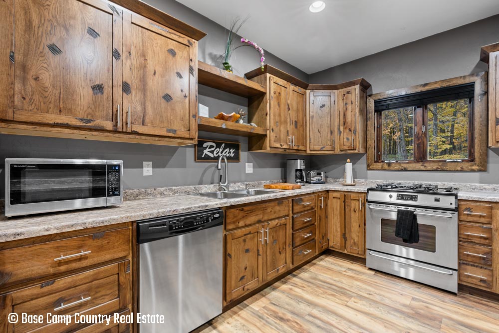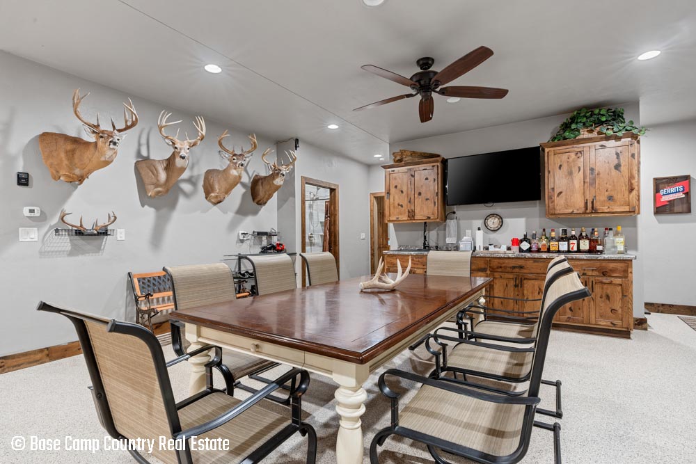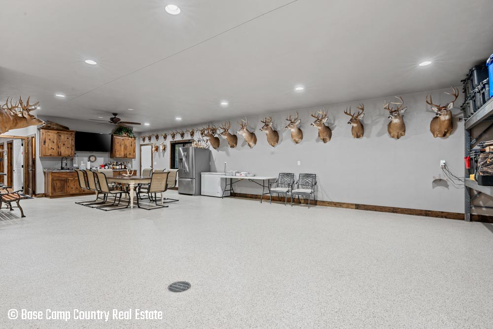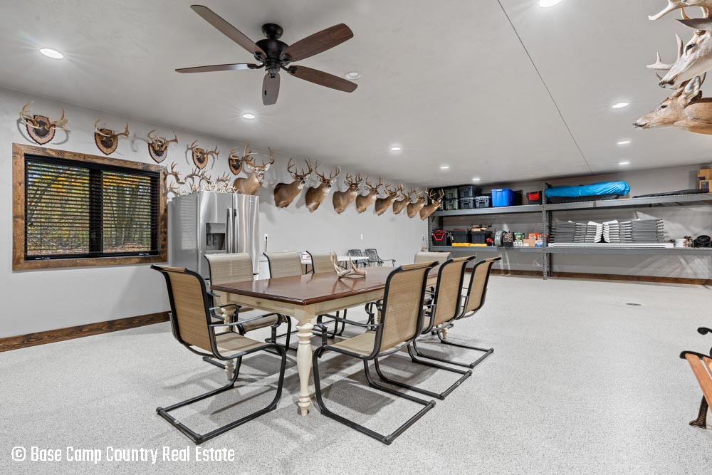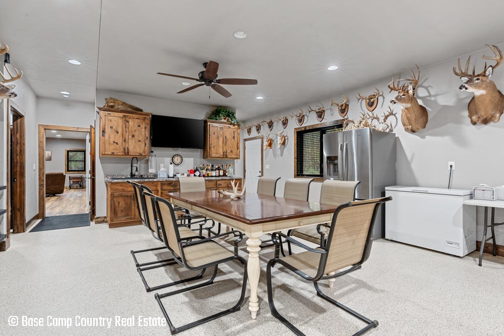 The kitchen showcases custom hickory cabinetry, a black walnut countertop, and high-quality LG and Frigidaire appliances. Perfect for entertaining or preparing post-hunt meals, the home also includes a garage with epoxy flooring, a dedicated scent-free hunting room for gear and a commercial-grade deep fryer with a professional hood system.