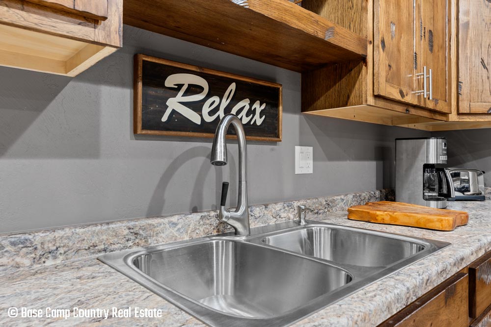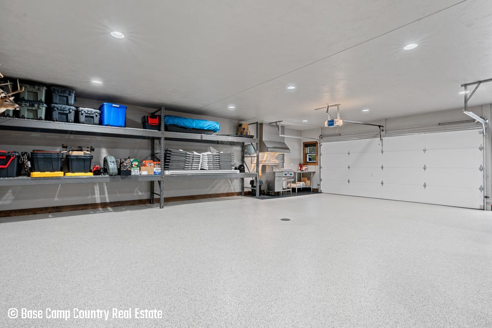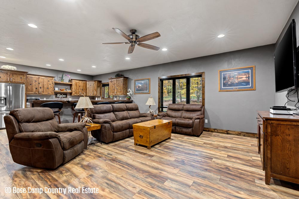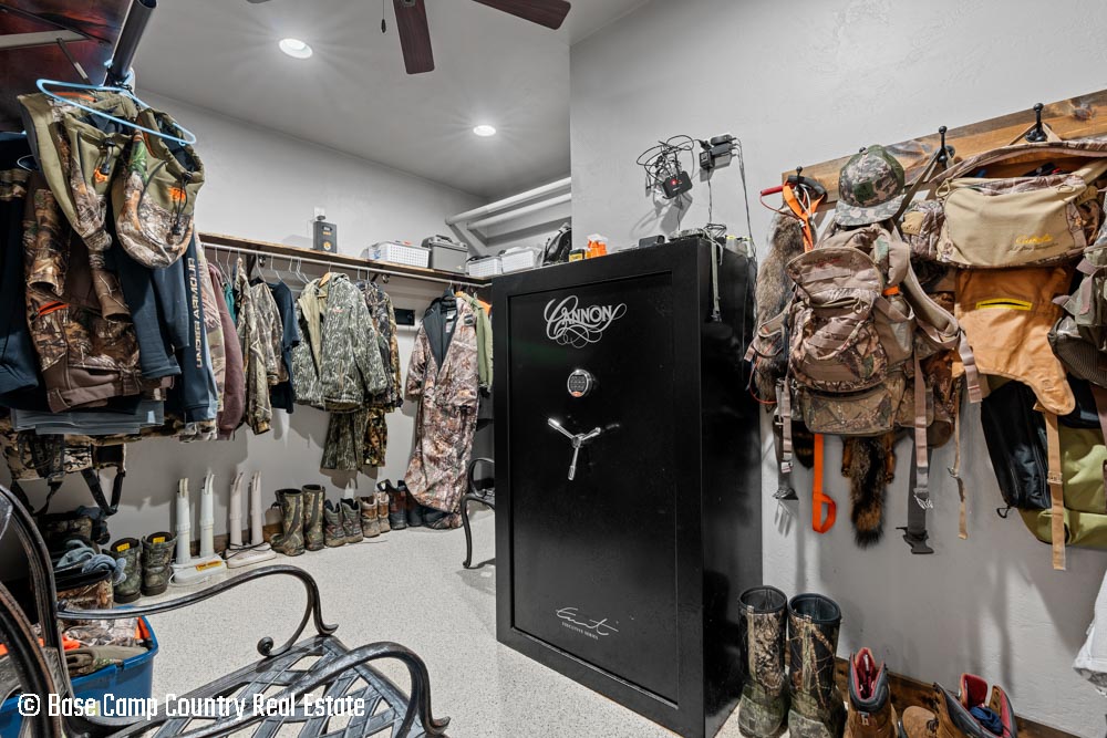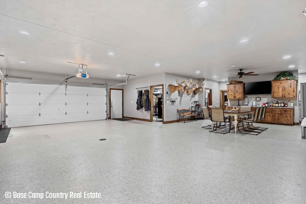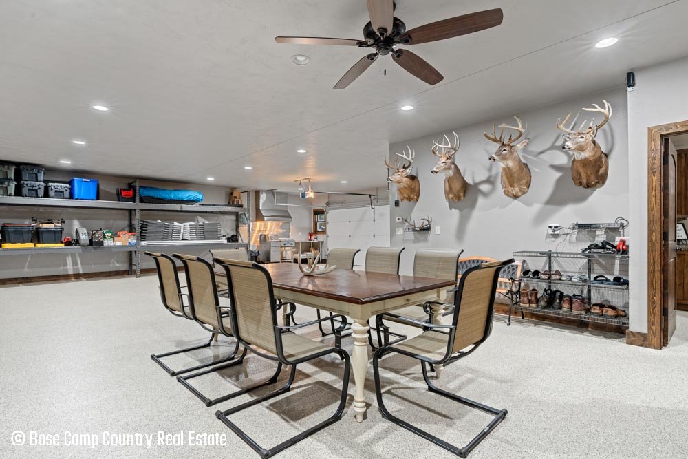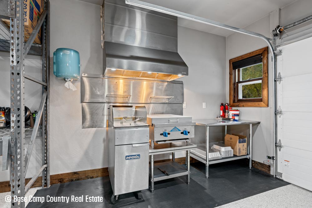The kitchen showcases custom hickory cabinetry, a black walnut countertop, and high-quality LG and Frigidaire appliances. Perfect for entertaining or preparing post-hunt meals, the home also includes a garage with epoxy flooring, a dedicated scent-free hunting room for gear and a commercial-grade deep fryer with a professional hood system.