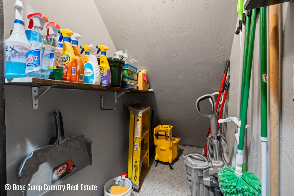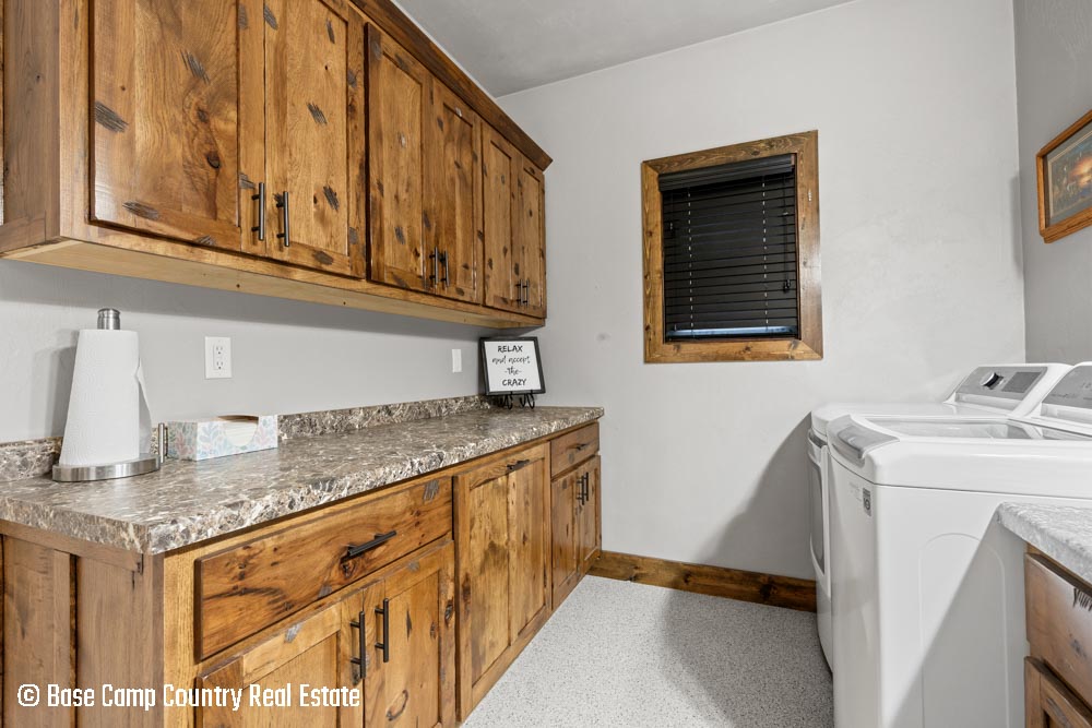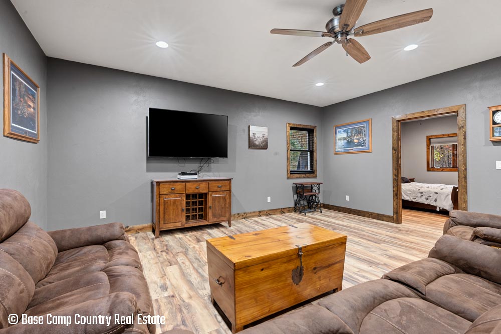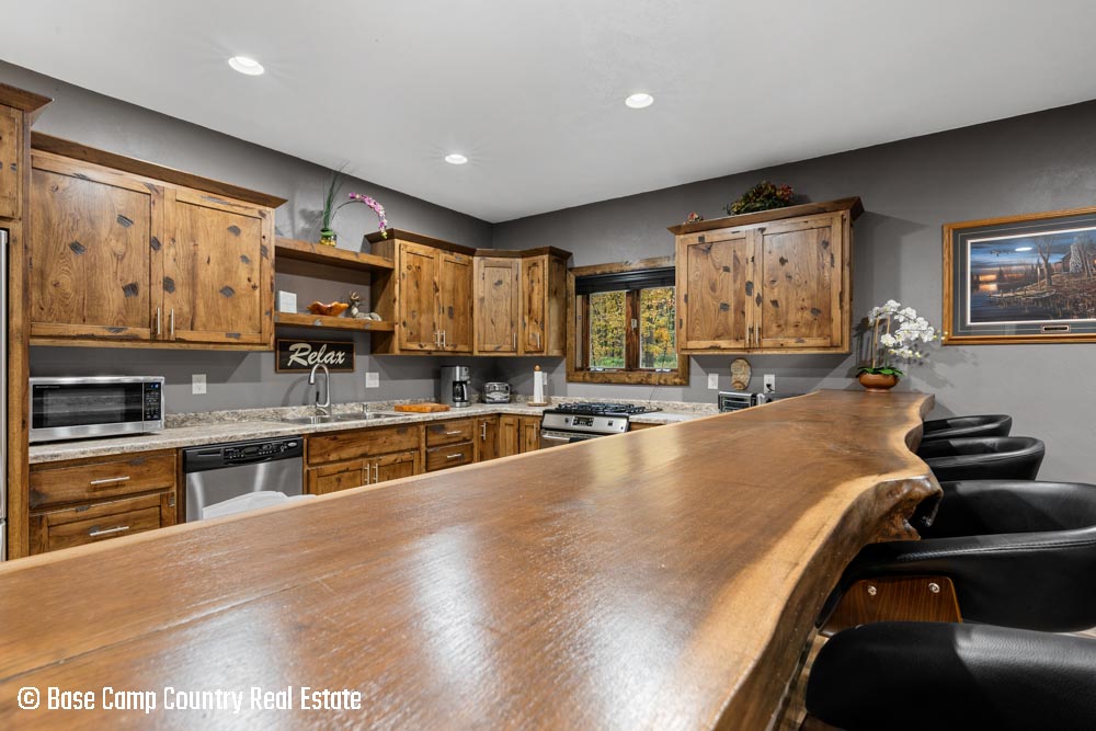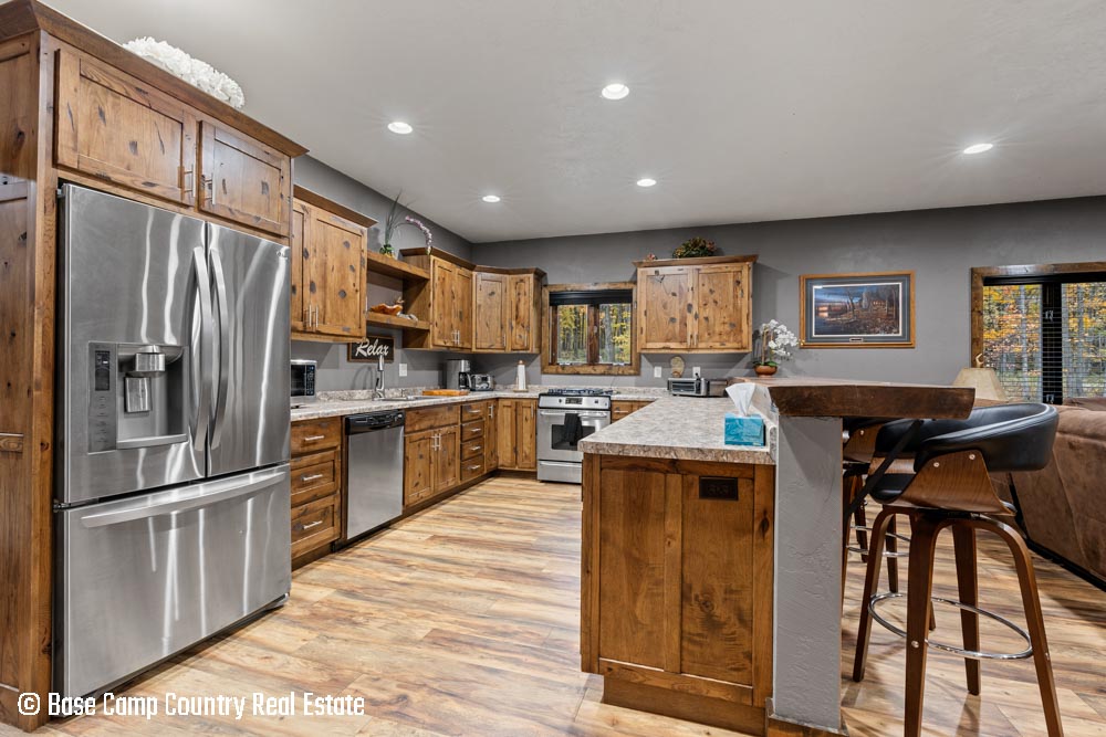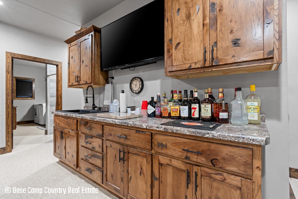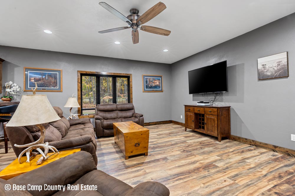 The kitchen showcases custom hickory cabinetry, a black walnut countertop, and high-quality LG and Frigidaire appliances. Perfect for entertaining or preparing post-hunt meals, the home also includes a garage with epoxy flooring, a dedicated scent-free hunting room for gear and a commercial-grade deep fryer with a professional hood system.